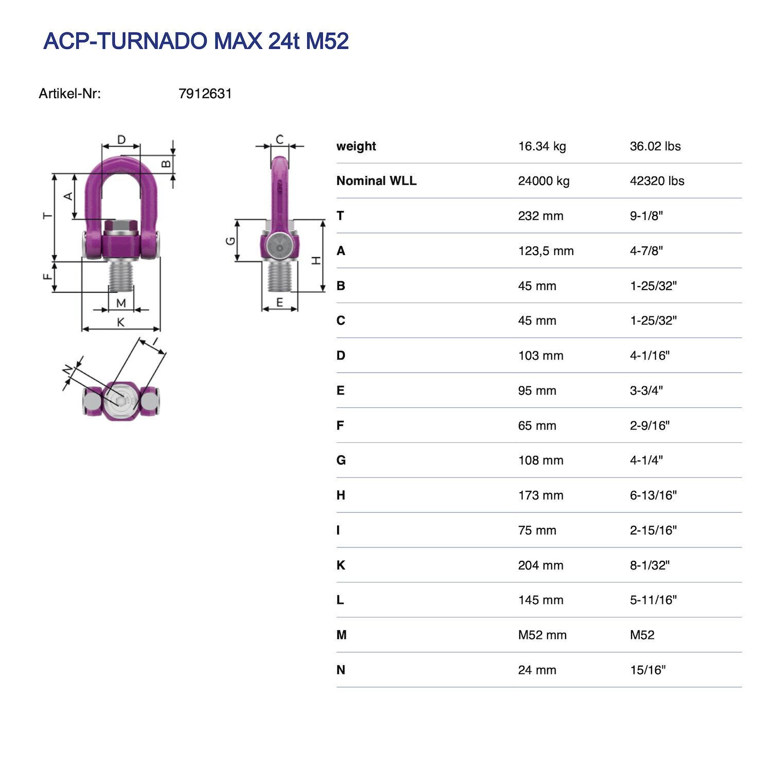 Specific features of the ACP-Turnado Max M52 are the Innovative exterior spring mechanism which prevents vertical stopping of the lift bail. Deflector disc with angle marking, WLL information in “t” and “lbs”, safety factors, and torque moment. Combination head screw with internal and external hexagon for optimized handling; threaded pin – firmly connected. Free space for individual marking/stamp.