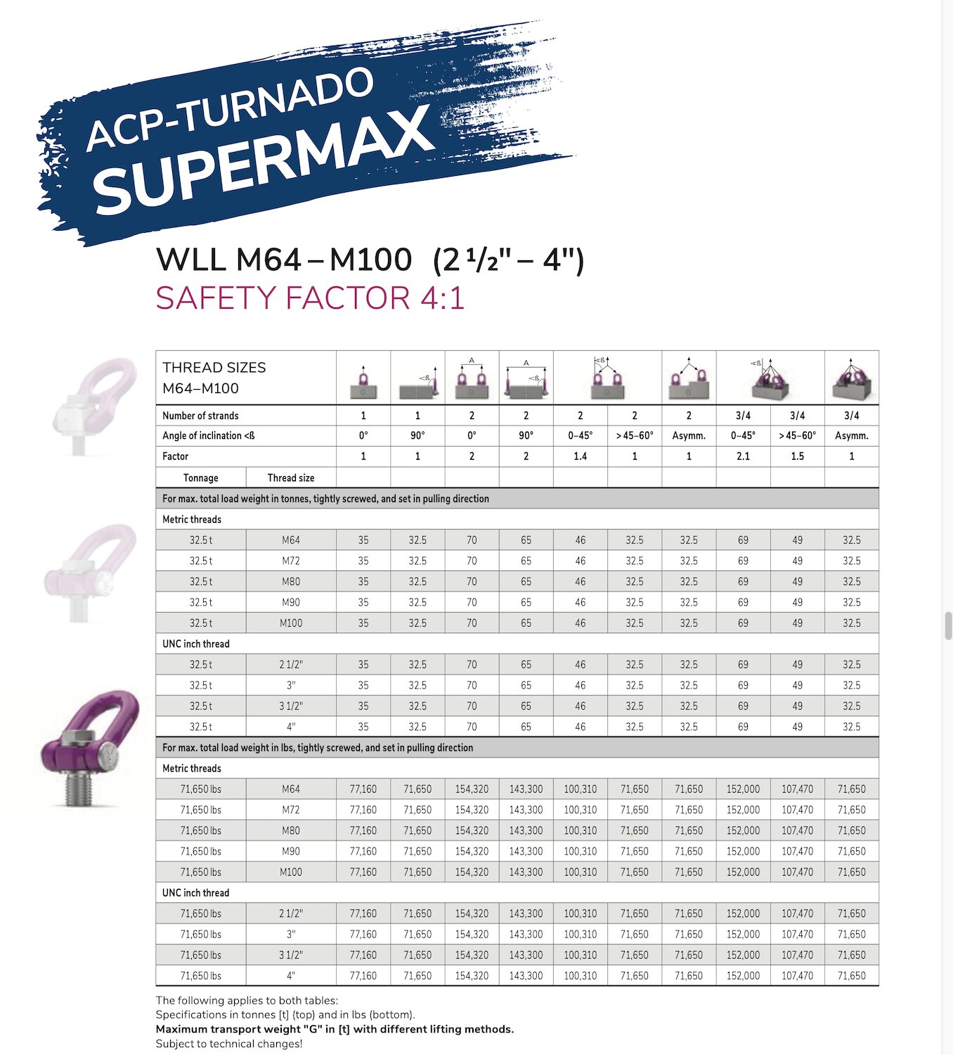 Specific features of the ACP-Turnado Supermax M72 are the Innovative exterior spring mechanism which prevents vertical stopping of the lift bail. Deflector disc with angle marking, WLL information in “t” and “lbs”, safety factors, and torque moment. Threaded rod – firmly connected. Free space for individual marking/stamp. Swivel joint in the lifting ring axis.