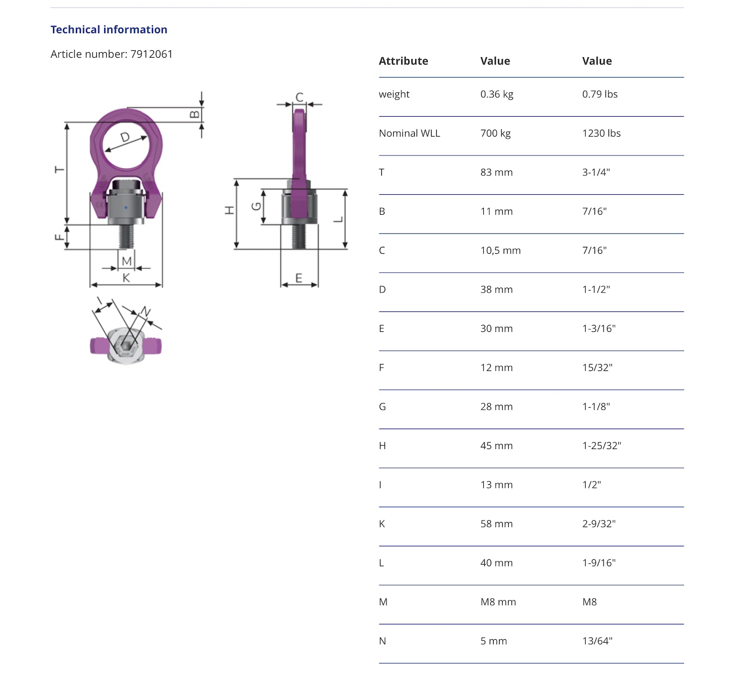 The common features of all the ACP-Turnado designs are an innovative spring mechanism which prevents the lift bail from stopping with transverse load. Swivel joint in the lifting ring axis. Wear lenses for checking discard criteria. Integrated RFID transponder to make checks easier. Safety factor of 4:1. Meets and exceeds the requirements of the American standard ASME B30.26.